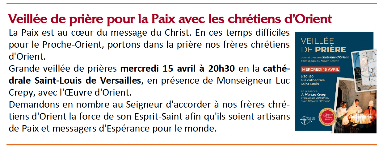 Veillée de prière pour la Paix avec les chrétiens d'Orient.